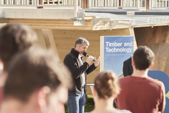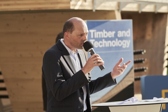 Il s'agit maintenant, dans le domaine de construire des infrastructures en remplaçant le béton armé par des matériaux qui stockent le CO₂. remplacer les matériaux tels que le bois. Pour ce faire, la Haute école spécialisée bernoise a développé, en collaboration avec avec TS3 et d'autres partenaires économiques, a élaboré une stratégie de recherche et a réalisé un prototype d'un élément de pont. Celui-ci a été inauguré dans le cadre de l'ICTB.