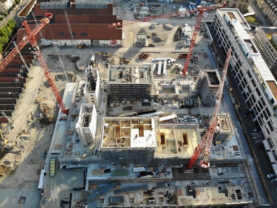 Photo de chantier des travaux de l'immeuble en bois Krokodil avec plus de 250 appartements.