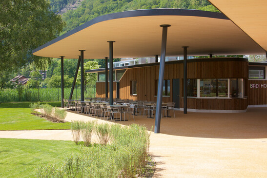 Un toit principal aux courbes organiques accentue l'accès accueillant à la plage et ombrage les places assises du restaurant. steinerARCHITEKTUR a conçu le toit en filigrane sur de fins poteaux en acier avec une trame d'à peine 8 x 8 mètres. Cette construction apparemment en apesanteur est possible grâce à la possible grâce à la technologie TS3.