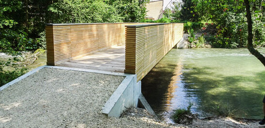 Le nouveau pont devait s'adapter aux fondations de la traversée d'origine, la situation d'appui des culées devait donc être reprise. Le nouveau pont a été conçu comme un pont en auge. La structure primaire est composée de deux poutres en bois lamellé-collé. Les poutres transversales en acier sont fixées aux poutres primaires par le bas à l'aide de tiges filetées collées. Grâce à cet assemblage résistant à la flexion, la poutre primaire est stabilisée et ne peut pas basculer. Les longerons du tablier sont en bois lamellé-collé de mélèze, le revêtement en bois de chêne. Avec le nouveau pont, il y a plus d'espace entre l'eau et le pont qu'auparavant - un avantage en cas de crue. Jusqu'à présent, le bois flottant risquait de s'accumuler, d'endommager le pont et d'inonder les terres avoisinantes.