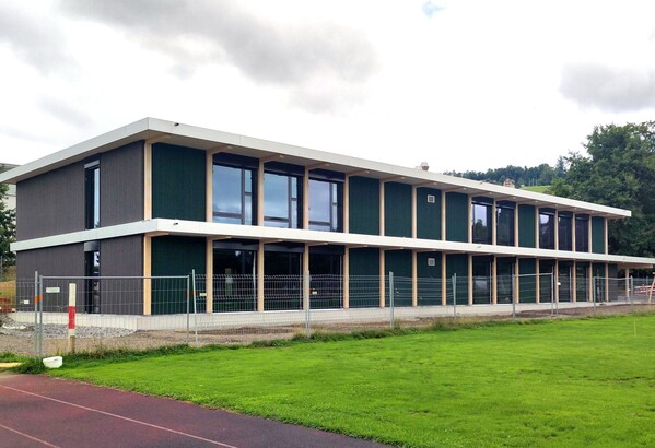 Pour agrandir l'espace scolaire à Mettmenstetten, une école primaire et un jardin d'enfants de deux étages ont été construits en bois, avec une superficie au sol d'environ 13 m x 40 m. Le bâtiment de deux étages n'a pas de sous-sol. Il mesure environ 7,8 mètres de haut et est conçu de manière à pouvoir être surélevé d'un étage.