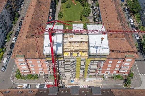 Situé au cœur du 3e arrondissement de Zurich, l'immeuble résidentiel existant de la Nussbaumstrasse 18 fait l'objet d'une rénovation complète et est agrandi de deux étages supplémentaires sous forme de combles aménagés dans une construction en bois. La surélévation permet de créer de nouveaux espaces de vie contemporains, tandis que les plans des étages existants sont adaptés aux exigences actuelles. Le nouveau toit en pente s'harmonise avec les toits en croupe des bâtiments voisins et s'intègre parfaitement dans l'environnement urbain.