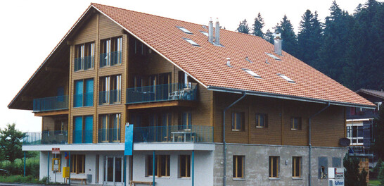La poste et la banque Raiffeisen, qui vont de pair pour des raisons de sécurité, ont été planifiées sur le côté est du bâtiment. L'entrée principale centrale avec un porche offre une protection aux usagers du bus qui attendent et en même temps un espace pour les cases postales, la boîte aux lettres et la station téléphonique. Le premier étage et la cage d'escalier ont été construits en dur. Les autres étages ont été construits en ossature bois avec des planchers en planches empilées. L'avantage de ces plafonds en bois massif était que le maître d'ouvrage pouvait utiliser son propre bois. Les façades ont été conçues comme des façades en bois ventilées par l'arrière, doublées de plaques Fermacell incombustibles.