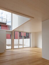 Nous nous sommes occupés de ce lotissement à Rain. Le garage souterrain existant a été suffisamment renforcé pour que les bâtiments de deux étages puissent être construits au-dessus. Au-dessus du sol, tout a été construit en bois avec des plafonds en bois visibles. Il a fallu tenir compte de la physique du bâtiment en raison de la présence d'une route principale très fréquentée.