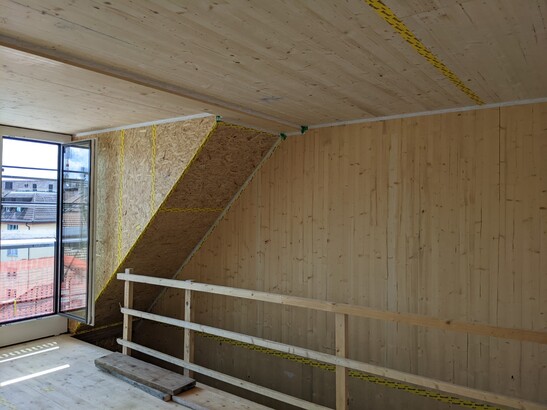 La surélévation est entièrement construite en bois. L'extension de la cage d'escalier et de la cage d'ascenseur a été réalisée avec des murs encapsulés en CLT. En raison de la géométrie de la pièce, les plafonds ont été réalisés en panneaux de bois contreplaqué. Une grille de poutres en acier a été posée sur la dalle en béton armé existante afin de transmettre localement les charges aux murs porteurs de l'étage inférieur.