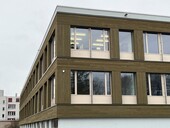 Un constructeur bois situé à proximité a préfabriqué avec précision les éléments de façade en ossature bois. Une grue mobile a soulevé les éléments de mur extérieur entre l'échafaudage de façade et la structure du bâtiment. Ceux-ci ont été fixés au gros œuvre. Le mode de construction choisi a permis une fermeture rapide de l'enveloppe du bâtiment et donc un début précoce des travaux d'aménagement intérieur. La dernière étape de montage a été la pose du revêtement de façade.