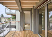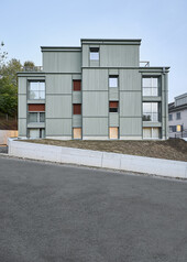 Le nouveau bâtiment de remplacement situé dans la Breitestrasse à Wallisellen est un immeuble collectif de quatre étages comprenant dix appartements, réalisé entièrement en éléments de construction en bois. La construction en bois repose sur des fondations en béton avec un parking souterrain. La façade ventilée en bois de sapin lasuré combine des lattes verticales et horizontales et intègre une barrière coupe-feu horizontale. La cage d'escalier est une construction économique en bois avec des éléments de charpente encapsulés ainsi que des escaliers et des paliers en béton préfabriqué.