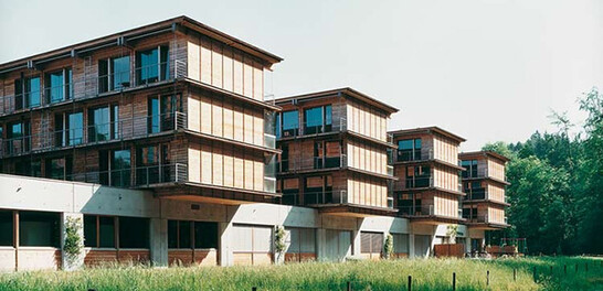 Les architectes n'ont pas prescrit la manière dont les 4 maisons d'habitation pour 100 étudiants devaient être construites, mais seulement les exigences auxquelles elles devaient répondre. Le reste - un concours de créativité. Une méthode inhabituelle et pas très équitable non plus. Car les bonnes idées ne sont pas payées, même si l'effort est énorme. Le projet a finalement été réalisé avec un système de construction par éléments en bois. La taille des éléments est à chaque fois adaptée aux chambres ; une mesure pour une meilleure isolation acoustique entre les chambres. Les balcons sont suspendus à l'extérieur par des barres d'acier à des poutres à simple ou double guidage.